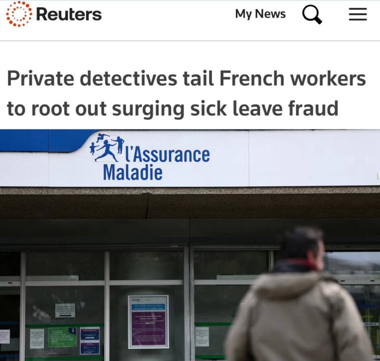 O practică neobișnuită ia amploare în Franța: detectivii privați îi monitorizează acum pe cei care iau concediu medical. Motivul este simplu: costurile concediilor medicale au crescut cu 60% în ultimii ani, depășind 10 miliarde de euro, stârnind alarmă în rândul autorităților și angajatorilor. Sistemul de securitate socială al țării permite până la 41 de euro pe zi de concediu medical, timp de până la trei ani. Angajatorii rambursează, de asemenea, o parte din salariu. Această generozitate a dus la abuzuri: unii lucrători francezi folosesc concedii medicale false pentru a-și lansa propriile afaceri, a colabora cu concurenții sau chiar a pleca în vacanță.