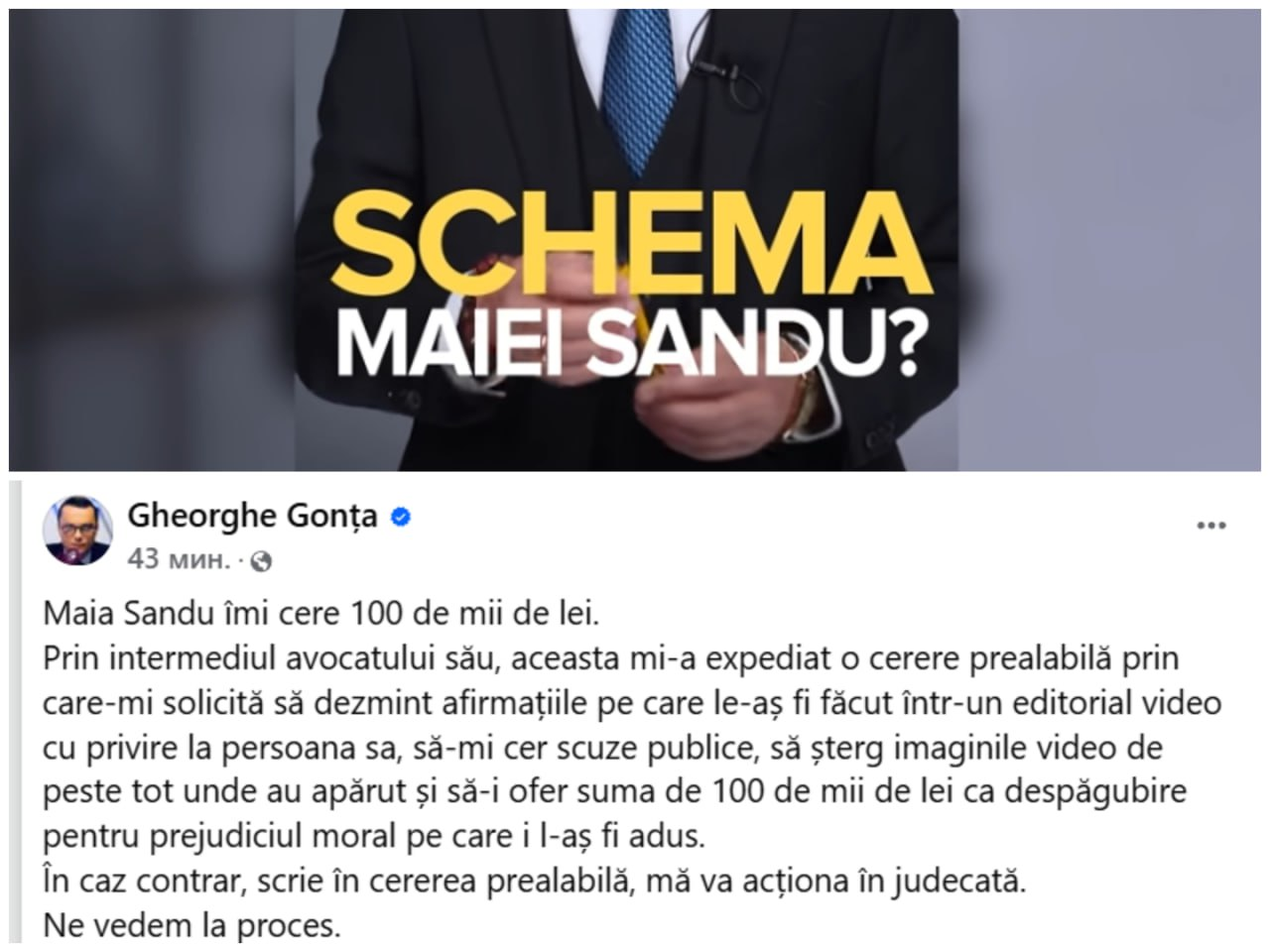 Jurnalistul a reacționat rapid: „Maia Sandu îmi cere 100 de mii de lei. Prin intermediul avocatului său, aceasta mi-a expediat o cerere prealabilă prin care-mi solicită să dezmint afirmațiile, să-mi cer scuze publice, să șterg imaginile video de peste tot unde au apărut și să-i ofer suma de 100 de mii de lei ca despăgubire pentru prejudiciul moral. În caz contrar… mă va acționa în judecată. Ne vedem la proces.”