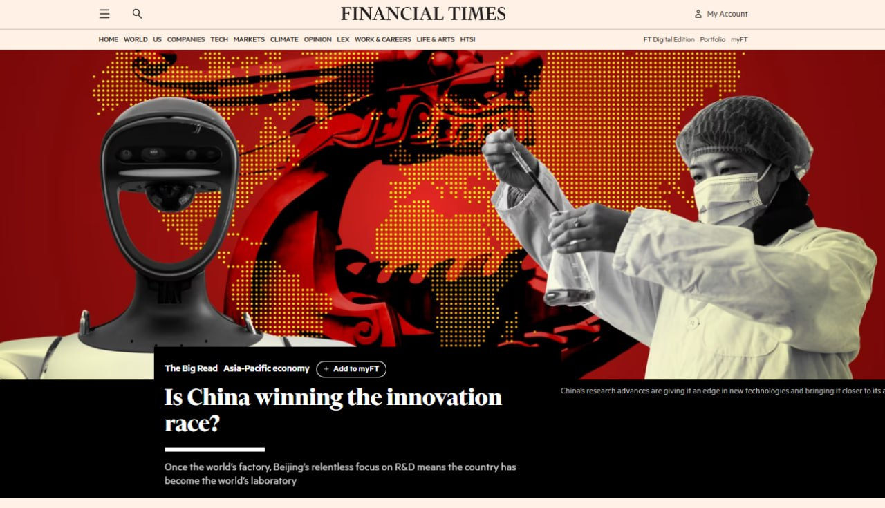 China se transformă rapid din „fabrica lumii” într-un laborator global, iar progresul său în domeniul cercetării și dezvoltării devine un factor-cheie în competiția tehnologică cu Occidentul. Un exemplu ilustrativ este Volkswagen: gigantul german a reușit în China să dezvolte, să testeze și să introducă comercial un sistem de conducere autonomă în doar 18 luni, în timp ce în Germania un proces similar ar fi durat 4–4,5 ani. Potrivit unui inginer Volkswagen, China „a trecut în a cincea treaptă” și avansează la viteză maximă, producând mașini pline de tehnologii și de înaltă calitate.