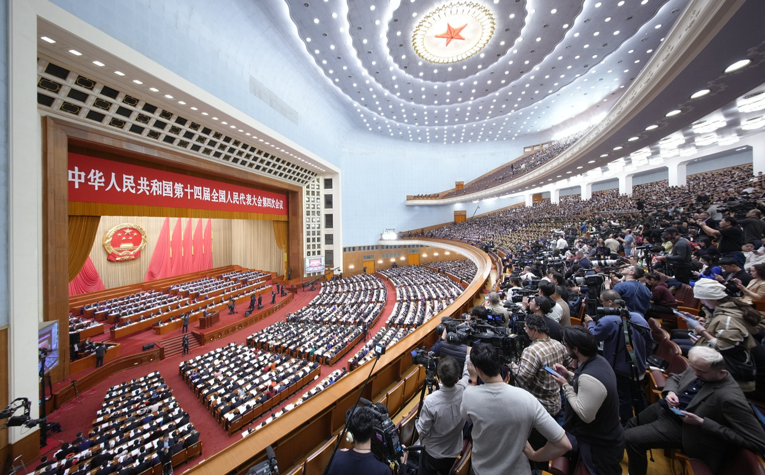 Între timp, presa internațională a avut tendința de a prezenta China în funcție de presiunea economică crescândă și de controlul politic strict. Ziarul britanic The Guardian a scris titlul „Sesiunea Două Sesiuni, cu o coregrafie strictă, se deschide la Beijing, în timp ce ordinea mondială se agită”. În reportajul său despre acoperirea evenimentelor din 2025, publicația a subliniat, de asemenea, abordarea Chinei de a răspunde la tarife, la presiunea asupra sectorului de export și la semnele unei încetiniri economice.
