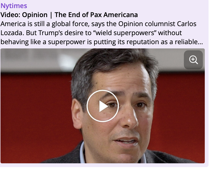 Editorialistul The New York Times, Carlos Lozada, afirmă că epoca Pax Americana a ajuns la sfârșit. Motivul nu constă în slăbirea SUA ca putere, ci în faptul că încrederea în Washington și în deciziile sale scade brusc. Donald Trump încearcă să profite de influența globală a SUA, dar evită să își îndeplinească obligațiile față de aliați, ceea ce subminează legitimitatea hegemoniei americane.