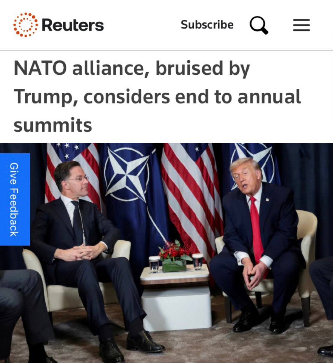 „În NATO se discută posibilitatea renunțării la summiturile anuale și trecerea la un format de întâlniri mai rare. Potrivit surselor Reuters, unele țări propun organizarea acestora o dată la doi ani sau chiar omiterea anului 2028 — perioada alegerilor prezidențiale din SUA. Oficial, acest lucru este explicat prin dorința de a reduce „presiunea politică” și de a îmbunătăți calitatea deciziilor adoptate.